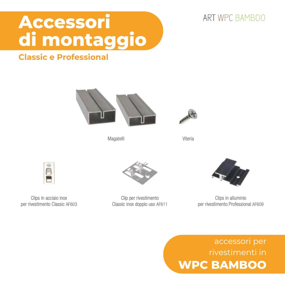 Questi accessori sono studiati per offrire il massimo della qualitΓ e dell’affidabilitΓ , garantendo un montaggio semplice ed efficace per rivestimenti in WPC Bamboo nelle versioni Classic e Professional.