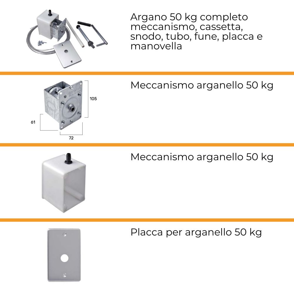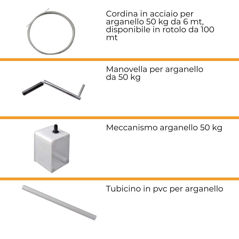 Sistema completo con meccanismo, cassetta, snodo, tubo, fune, placca e manovella, progettato per tapparelle con un peso massimo di 50 kg. Garantisce un sollevamento efficiente e sicuro.