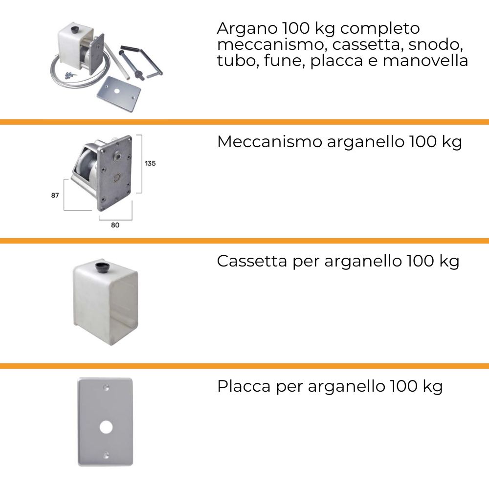 Sistema completo per tapparelle o serrande con un peso massimo di 100 kg, comprensivo di meccanismo, cassetta, snodo, tubo, fune, placca e manovella. Ideale per esigenze di sollevamento piΓΉ impegnative.