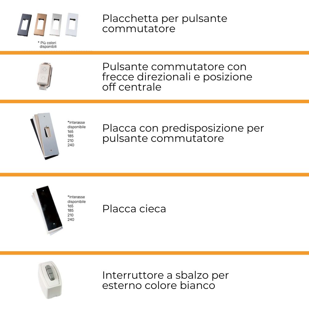 β’Placca con Predisposizione per Pulsante Commutatore: Progettata per coprire il foro di un avvolgitore manuale sostituito, in modo da integrare il pulsante senza interventi sulla parete. Codice: MOTPLINT1FAR/BR/BI/NE.