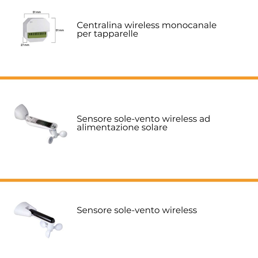 β’Sensore Sole-Vento Wireless: Sensore che utilizza alimentazione elettrica, registra i livelli di vento e luce per regolare la tenda automaticamente. Codice: MOTTANE116.