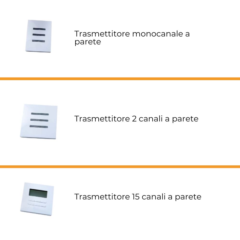 β’Trasmettitore a 15 Canali a Parete: Consente di controllare fino a 15 dispositivi. Codici: MOTTEL15CM559 e MOTTEL15CM1673.