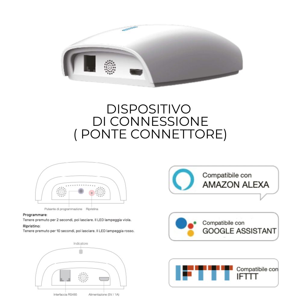 β’Ponte Connettore Wi-Fi: Consente di collegare tapparelle motorizzate, persiane e tende alla rete Wi-Fi, permettendo il controllo tramite app e lβintegrazione con altri dispositivi IoT.