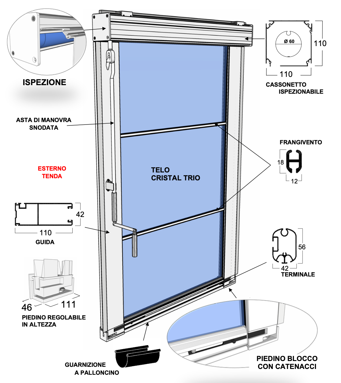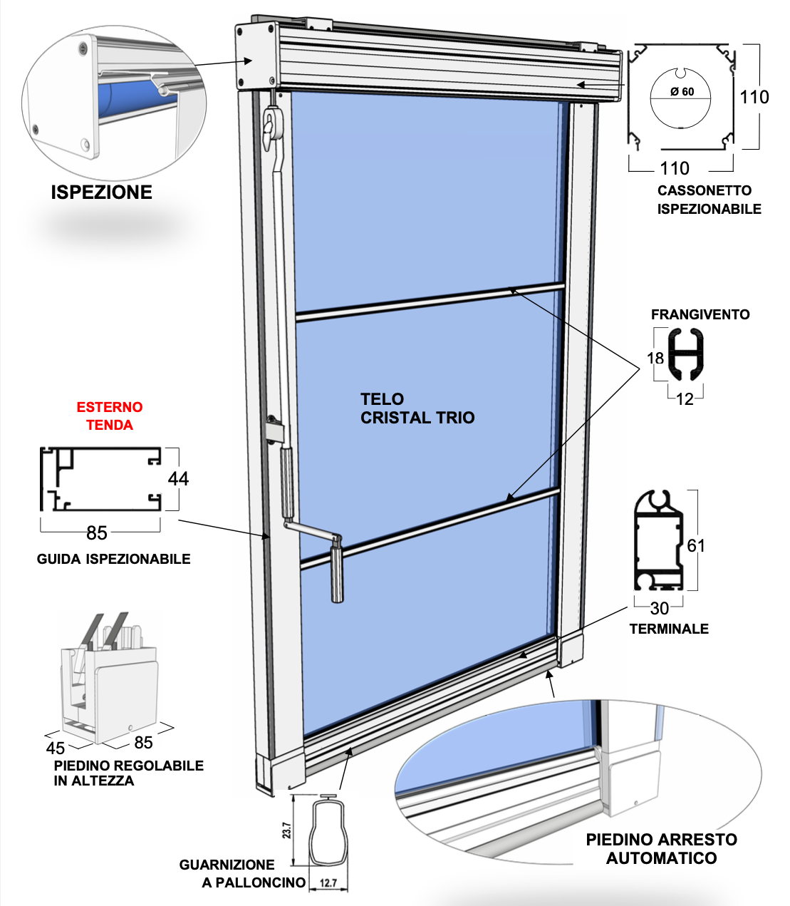 Il cassonetto superiore รจ apribile affinchรฉ il tessuto possa essere cambiato senza smontare la tenda.