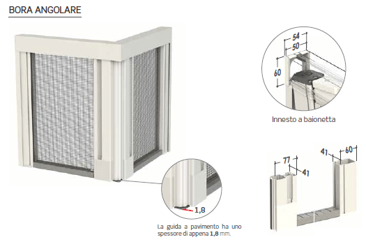 Note: adatta per porte-finestre fino a 180 cm di larghezza a seconda della rete, guida bassa dallo spessore di soli 1,8 mm.