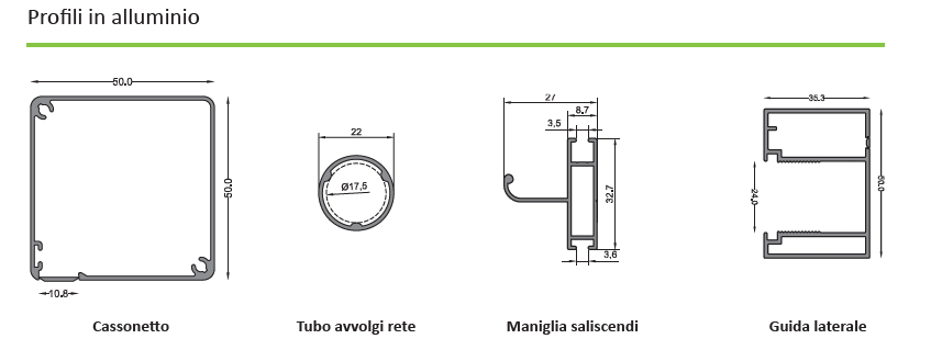 Zanzariera a scorrimento verticale con avvolgimento a molla adatta per porta/finestra con cassonetto quadro ingombro 50mm compensazione di errori sia in larghezza che in altezza.