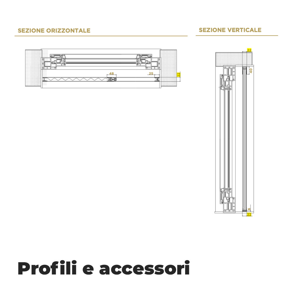 Eฬ possibile avere la versione a piuฬ ante con chiusura centrale, asimmetrica e apertura bi-laterale.