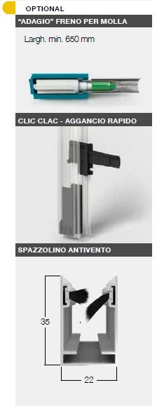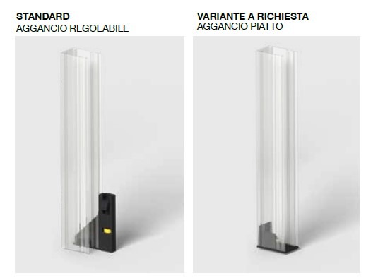 La versione standard prevede le guide con spazzolino tradizionale e aggancio regolabile, particolarmente indicato per installazioni su vani fuori squadro.