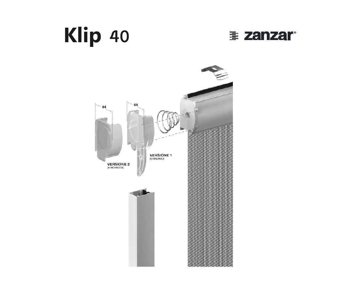 Klip 40 è una zanzariera Zanzar ad avvolgimento a molla e scorrimento verticale, con cassonetto arrotondato di 40 mm, adatta a qualunque tipo di porta e finestra. Gli accessori, dal design innovativo, ne fanno un prodotto in linea con le attuali tendenze del mercato.