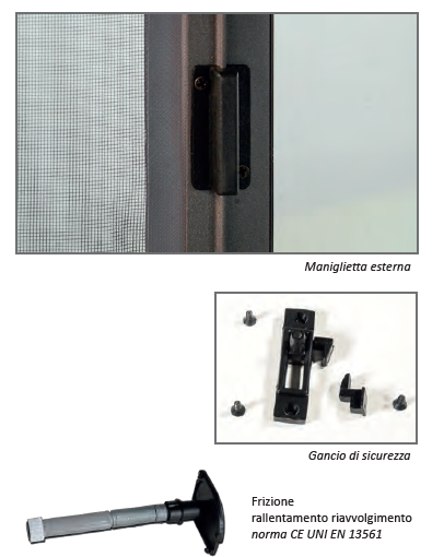 Oltre alla rete tradizionale si possono richiedere l’inserimento di teli oscuranti, filtranti, zebra, rete sunox e look-out. Rete elettrosaldata sui lati con applicazione di bottoncini antivento che evitano la fuoriuscita della rete dalle guide.