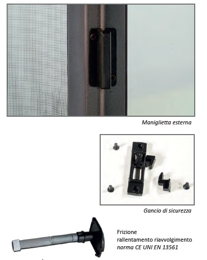 Oltre alla rete tradizionale si possono richiedere l’inserimento di teli oscuranti, filtranti, zebra, rete sunox e look-out. Rete elettrosaldata sui lati con applicazione di bottoncini antivento che evitano la fuoriuscita della rete dalle guide.