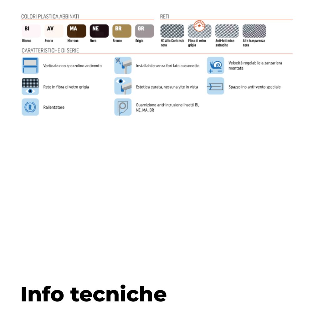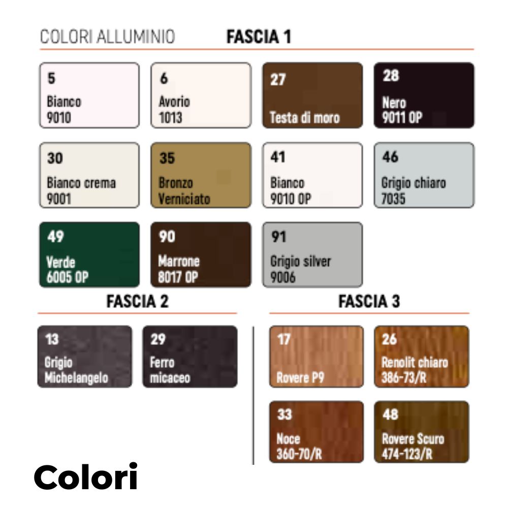 - Colori plastica abbinati: BI (bianco), AV (avorio), MA (marrone), NE (nero), BR (bronzo), GR (grigio).