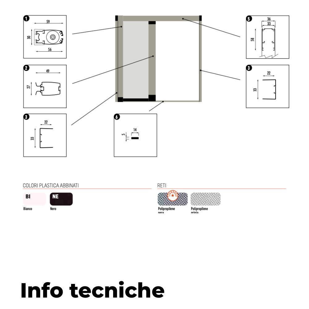 Componenti in alluminio certificati Qualicoat; rete PP con additivi anti-UV.