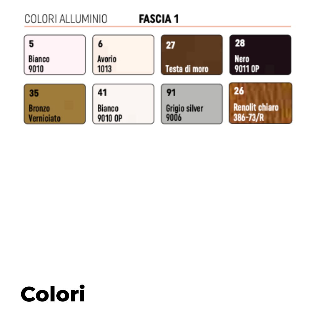 Gamma 30+ colori alluminio (RAL standard, tinte effetto legno, finiture opache)