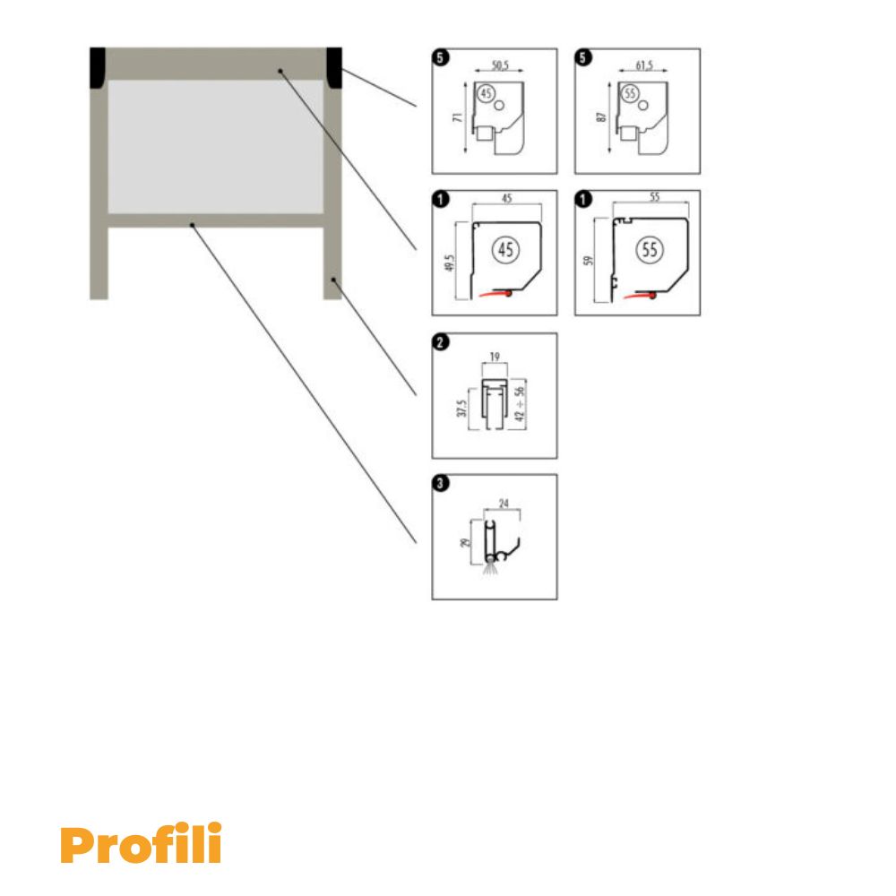 - Ingombro Cassonetto: Disponibile in due misure, 45mm per dimensioni massime di 180ร180 cm e 55mm per dimensioni massime di 180ร260 cm.