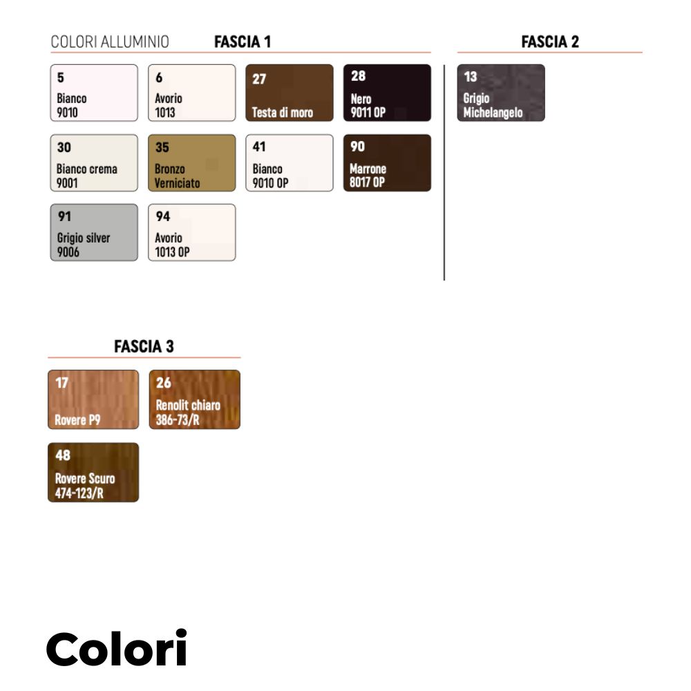 Colori plastica disponibili | Bianco (BI), Avorio (AV), Marrone (MA), Nero (NE), Bronzo (BR), Grigio (GR) |