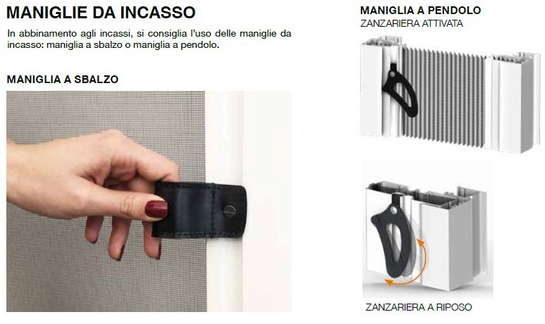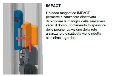 Il blocco magnetico IMPACT permette a zanzariera disattivata di bloccare la maniglia della zanzariera verso il dorso, contenendo lo spessore delle pieghe. La visione della rete a zanzariera disattivata viene ridotta al minimo ingombro