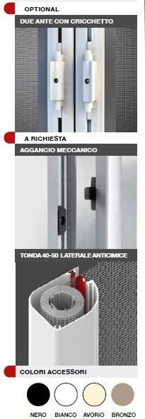 Tonda 40 50 Laterale è una zanzariera ad avvolgimento a molla con scorrimento orizzontale e chiusura magnetica (a richiesta con aggancio meccanico).